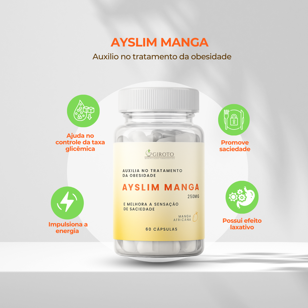 O extrato de Ayslim Manga auxilia no tratamento da obesidade, melhorando o processo de emagrecimento , é adjuvante na regulação da glicose no sangue e no tratamento do diabetes, controla as taxas de colesterol e triglicerídeos, possui efeito laxativo e aumenta a saciedade , reduz a ingestão calórica e ajuda na manutenção de uma dieta equilibrada.