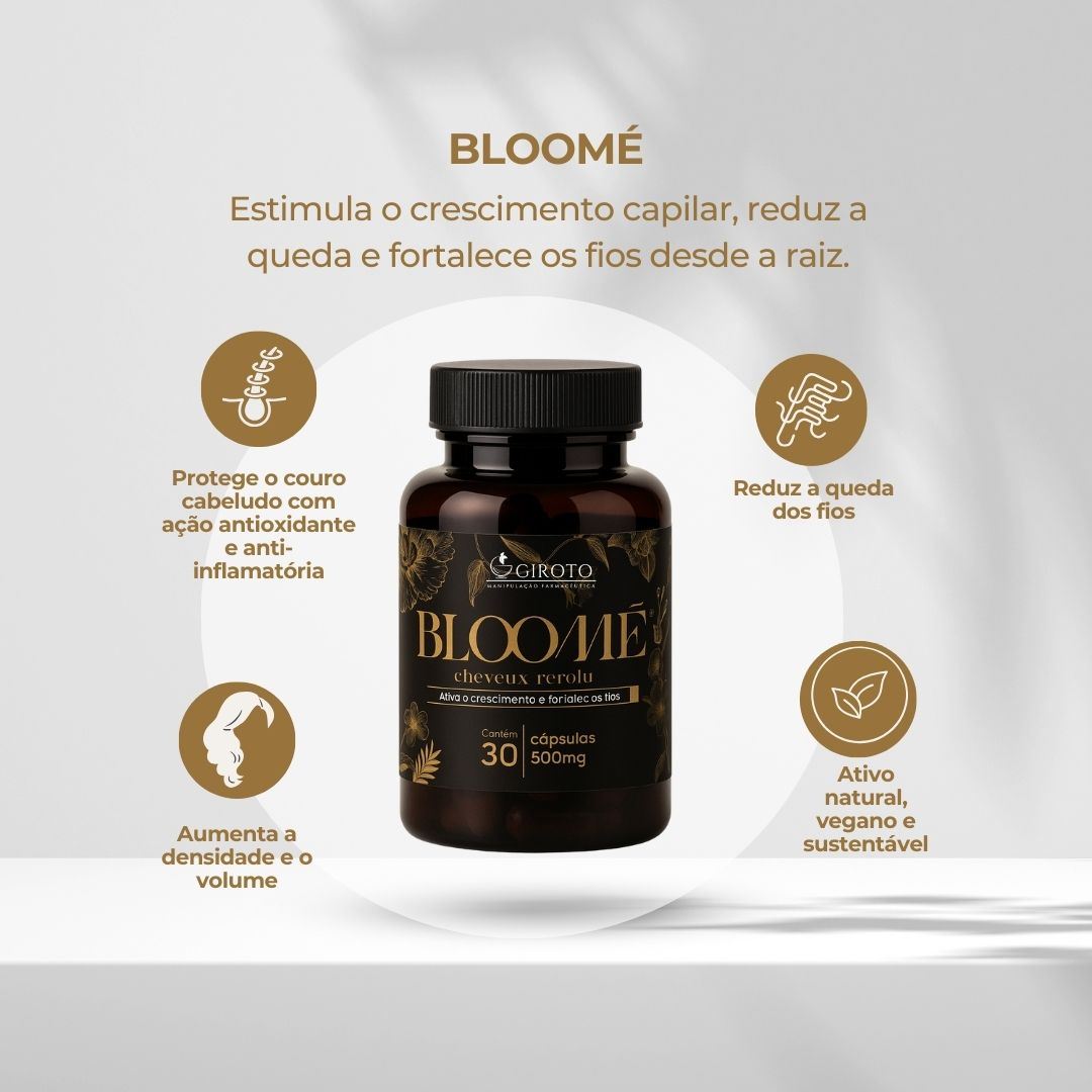 O Bloomé® é um ativo natural e autêntico, desenvolvido para estimular o crescimento, fortalecer desde a raiz e reduzir a queda, promovendo fios mais densos, fortes e saudáveis.